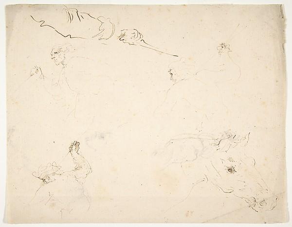 战斗中的人物和马头(校长);研究一个人的头部和手臂(verso)
