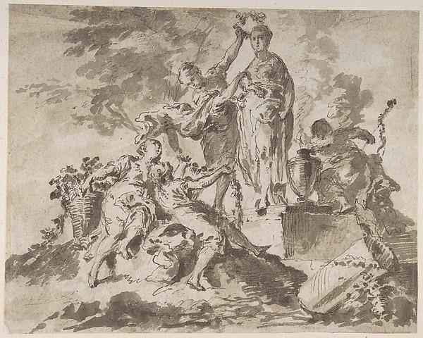 Nymphs Adorning the Statue of a Goddess (recto); River God with Three Nymphs (verso)