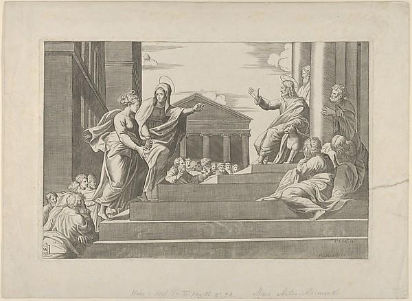 Martha leading Mary Magdalene up a flight of stairs to Christ who is seated at right at the entrance to a temple