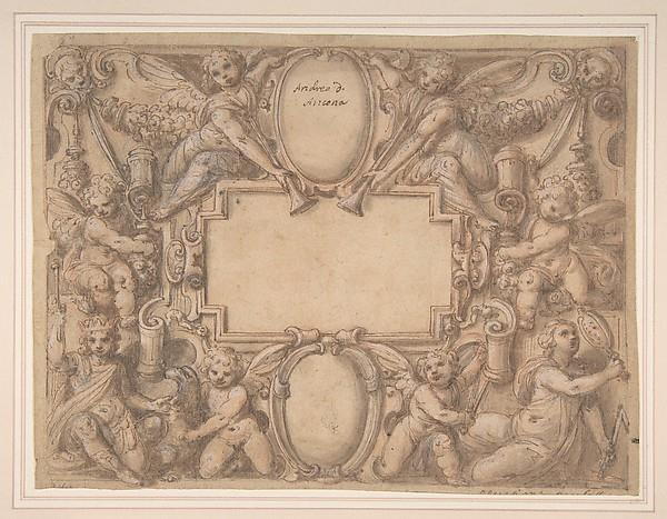 A Cartouche and Two Shields Surrounded by Allegorical Figures.