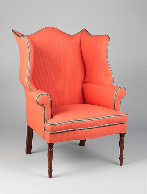Although easy chairs were widely produced in the eighteenth century, few examples from the early nineteenth century survive. The design of this chair is based on one that appeared in George Hepplewhite’s “Cabinet-Maker and Upholsterer’s Guide” (London, 1788). The substitution of turned front legs for the square, tapered legs specified by Hepplewhite implies that the chair was not produced until 1810–15, when rounded legs became more fashionable.