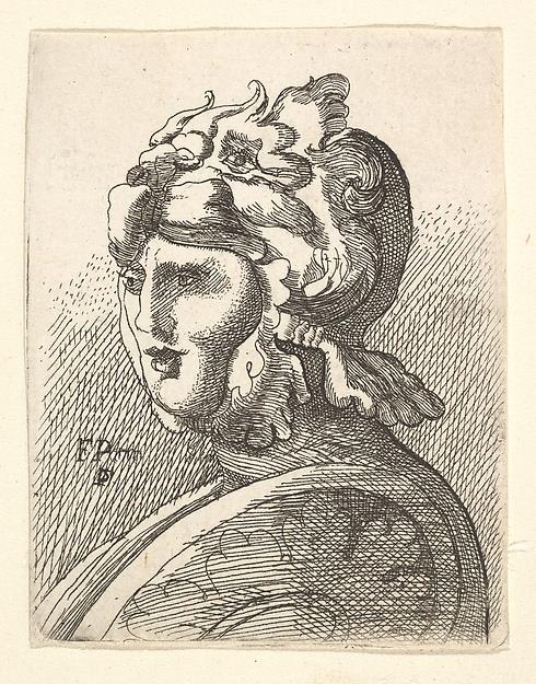 A warrior shown bust-length in three-quarter profile to left, wearing a helmet in the shape of a stylised lion's head, carrying a shield. Copy after Hollar's etching.