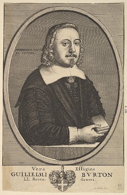 Portrait of William Burton, half-length, standing to right, leaning on a parapet with his right arm, holding a book entitled 'Antoninus'; wearing a broad white collar over academic gown and doublet; in an oval frame, with coat of arms below at centre of inscription space; illustration to William Burton's 'A Commentary on Antoninus his Itinerary' (London: 1658)