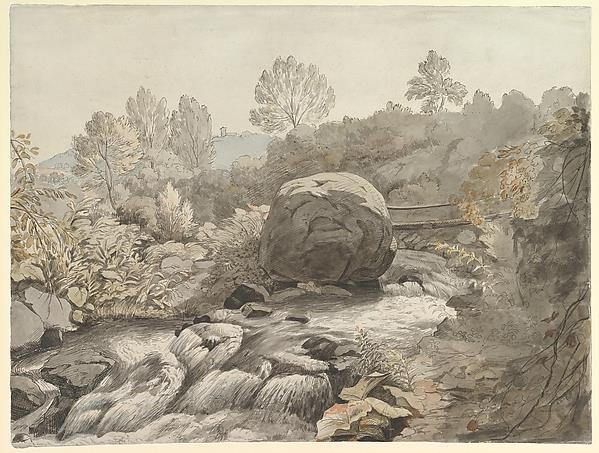 In addition to landscapes, Woodforde painted portraits and histories, contributing, for example, to Boydell's Shakespeare Gallery and to Macklin's Bible. He worked in Italy from 1786 to 1791, based in Rome and spending time with his most important patron Sir Richard Colt Hoare, who built Stourhead. It was probably on an excursion into the Campagna that he came upon the scene depicted here. At the center of the sheet, a large rock stands beside a rushing stream, flanked by foliage and surmounted by a small suspension bridge. An Italianate tower rises in the distance. Crisp pen lines combine with ink wash and subtly touches of watercolor to articulate a range of textures in a drawing that is at once descriptive and expressive.