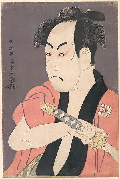 Focusing on bust portraits, Sharaku created bold and stylized depictions of Kabuki actors. In this portrait Ichikawa Omezō I (1781–1833), a disciple of Danjūro V, plays a warrior named Yakko Ippei who was unsuccessful in his attempt to defeat his enemy. On his robe the character for "O" in Omezō appears at the center of the Ichikawa family crest of three nested squares.