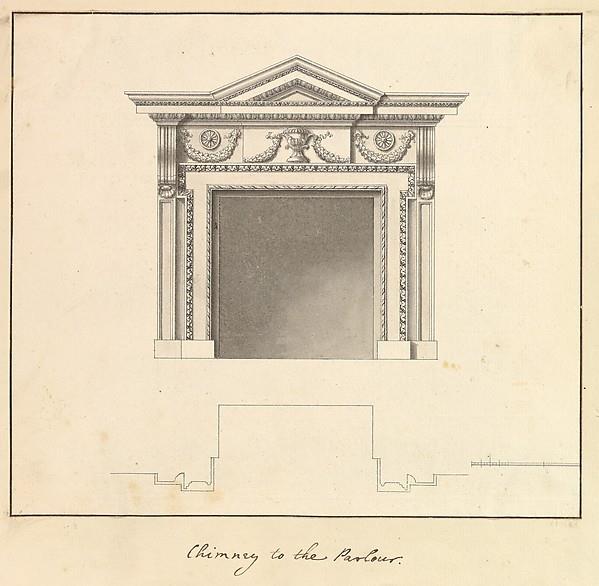 Elevation of chimney piece with plan below. This drawing relates to Isaac Ware's and Thomas Ripley's book "The Plans, Elevations and Sections, Chimney-pieces and Ceilings of Houghton in Norfolk" (first published 1735; second edition 1755 with added "Description of the Pictures at Houghton" by Horace Walpole).