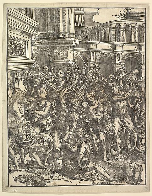 The Massacre of the Innocents (Right side) with group of male figures attacking women and children; classical buildings in the background