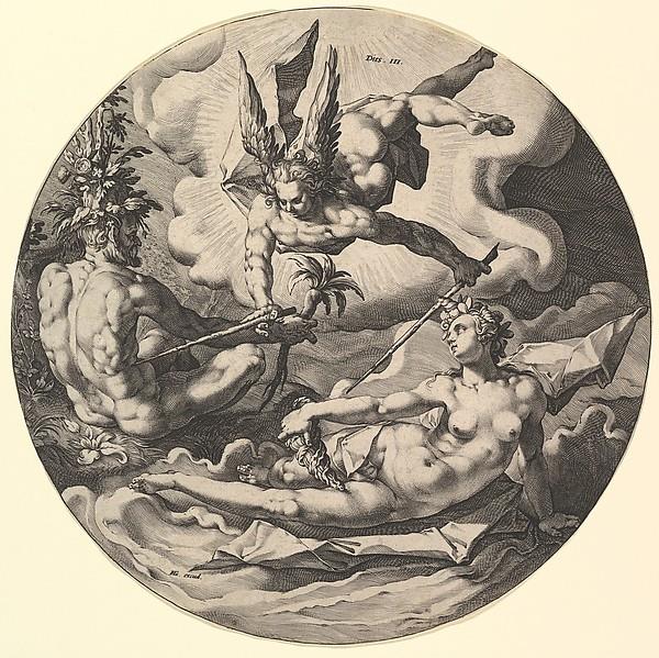 The series itself is extraordinary. Rather than following the centuries old traditional representations of the seven days of creation, based on the Book of Genesis, Goltzius looked instead to classical mythology for his imagery. It is often suggested that he was inspired by Ovid, the first century Latin poet, who describes the creation at the beginning of The Metamorphoses, his long poem about the gods and humankind.