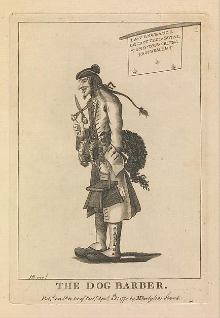这个吃不饱的法国人,准备给一只倒霉的贵宾犬梳理毛发,来自马修和玛丽达利于 1771 年出版的一套二十四幅漫画。作为一对夫妻团队,达利夫妇开发了一种新的英国印刷类型——在朴素的背景下对单个人物进行小型蚀刻漫画,通过着装、姿势和一些道具来表明他们的身份。其中许多作品嘲笑了当代伦敦花花公子的时尚举止,称为"通心粉",达利的商品很快就被称为通心粉印花,无论其主题如何。隐含的意大利联系实际上是恰当的,因为基本形式受到Ghezzi的漫画画的启发,这些漫画画是由大游客从罗马带回来的。达利夫妇改编的形式和主题激发了英国人的口味,并扩大了盖齐作品的范围,包括一系列社会阶层、知名人物和类型。"狗理发师"展示了一个外国商人,由熟练的业余爱好者亨利威廉班伯里设计。