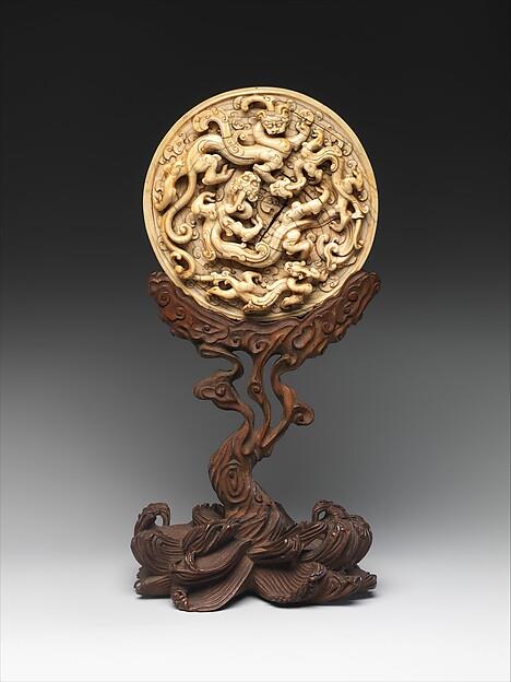 This disc either may have been used as inlay to decorate another a piece of furniture or a screen, or functioned as an independent work of art. Known as chihulong, the four snakelike dragons—two large, two small—prowling along the surface are identifiable by their long, narrow necks, the raised lines across their backs, and their branching tails.