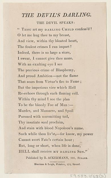 Text that accompanies related Rowlandson print, the Devil sings a lullaby to Napoleon and identifies him as his darling son.
