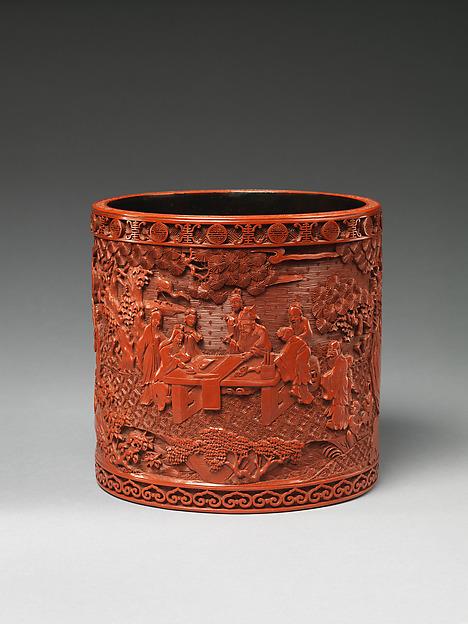 This brush pot shows scholars writing, painting, and enjoying nature—activities found in imagery of scholar-officials throughout Chinese art. The scene also recalls famous historical gatherings of learned men such as those in the West Garden, an eleventh-century imperial family residence.