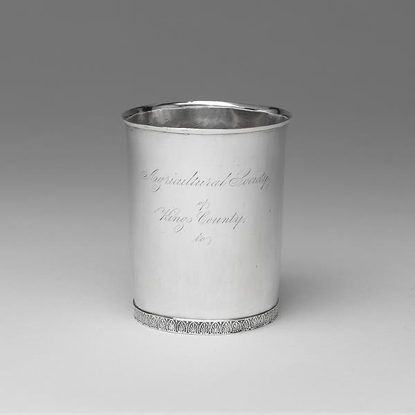 整体: 高 3 1/2 英寸 (8.9 厘米); 4 盎司 8 dwt. (136.1 g) Lip: 直径 2 7/8 英寸 (7.3 厘米) Base: 直径 2 9/16 英寸 (6.5 厘米)