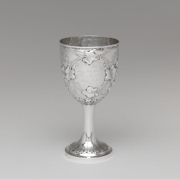 This goblet, one of a pair (1970.200.4), and a matching pitcher (1970.200.2) are decorated with a grapevine motif chased in repoussé and ruffled leaves that recall eighteenth-century rococo ornament. The set originally belonged to the donor’s grandmother Grizelda Gilchrist Polk, who married Russell Houston, chief attorney for the Louisville-Nashville Railroad. Her monogram, "GGH," is engraved on the front of the pitcher. The goblets are inscribed to two other members of the Polk-Houston family.