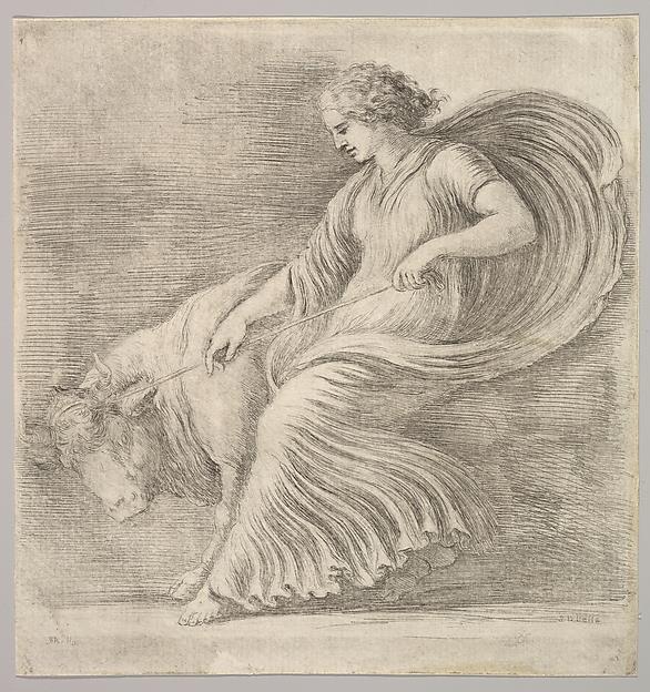 A woman in profile pulling back on a rope tied around the horns of a young bull