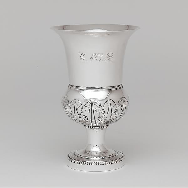 整体: 6 5/16 英寸 (16 厘米); 8 盎司 6 dwt. (258.9 g) Lip: 直径 4 1/8 英寸 (10.5 厘米) Foot: 直径 2 11/16 英寸 (6.8 厘米)