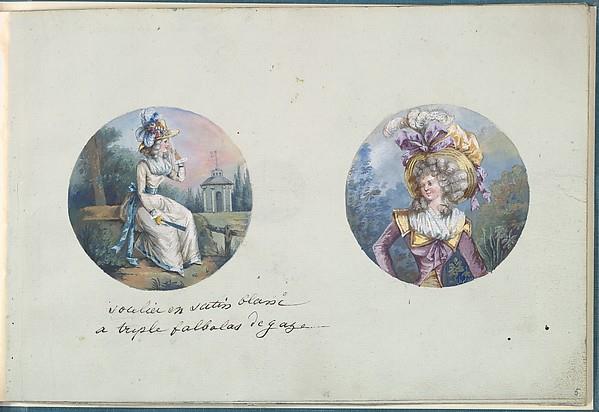 Page with two round portraits or costume designs. The left portrait is of a full-length woman seated on a bench facing right. She is wearing a white corseted dress with a fichu tucked into the bodice and a blue ribbon around her waist. She has a straw hat with blue feathers and a veil. The portrait on the right shows of a woman from the waist up, in a frontal position, but gazing towards the left. She is wearing a purple and yellow dress with a fichu tucked into her bodice. She has a straw hat with a purple ribbon and white feathers.