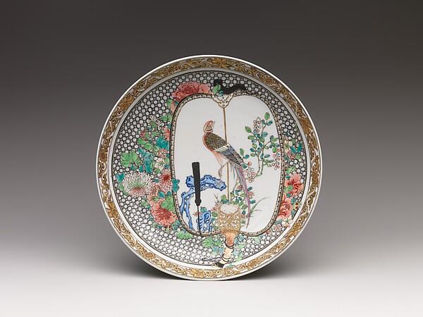 The layering of designs on this dish illustrates the dense and precise decoration that typifies the art of the Qianlong period in China. A short-handled fan with a pheasant perched on a flowering branch fills the center of the open space. The ornamental patterns on the edges of the fan and the rim of the plate are also characteristic of the eighteenth century.