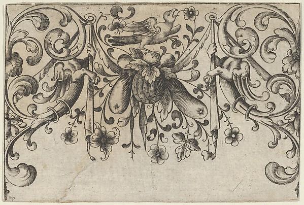 Ornament design with a bird standing on a bushel of fruit, facing right and standing on right leg, at center. On right and left, grotesque figures with tendrils in the shape of bird's heads and winged lion's bodies.