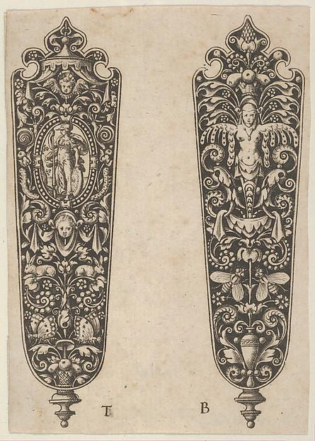 两个匕首手柄设计。左边的照片显示了一个武装的女性形象,在中心的椭圆形中,在一个带花环和两只兔子的普提面具上方。右边的设计描绘了一个女性躯干,烛台顶部有翅膀。这两个设计都是以怪诞的黑色背景为背景的。