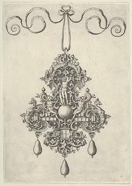 垂直面板,中心有吊坠设计,一名男性营养师右手边拿着盾牌,站在中心的球体上,周围环绕着系带装饰和怪诞。在两侧,两个裸体斜倚的男性人物向外面对龙头怪。这件饰品挂在一条缎带上,有三颗珍珠从底部、左右两侧垂下。盘子2,由十个盘子组成,有吊坠设计,有神和系带背景。该系列的第一版于1581年由菲利普·加勒在安特卫普出版,分为两个州;后来的两个版本——第一个由西奥多·加勒于1600年后出版,第二个由约翰内斯·加勒在1636年后出版——也在安特卫普制作。Jan Collaert I制作了几个带有吊坠设计的系列盘子,他的儿子Adriaen Collaert继续进行这一实践。