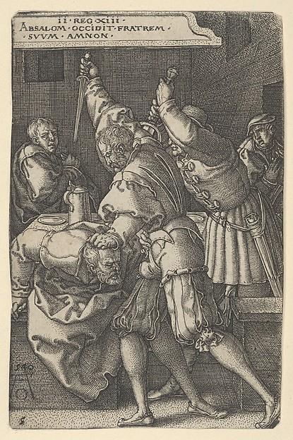 Two of Absalom's servants raise daggers to stab Amnon while two figures watch. Based on 2 Samuel 13:29. Plate 5 from a series of seven plates with the Story of Amnon and Tamar.