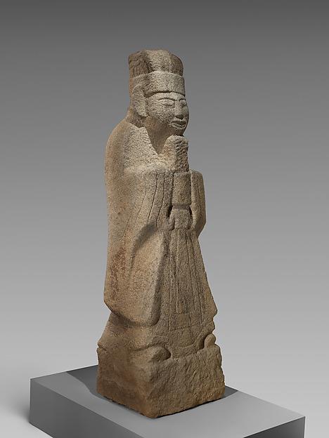 在朝鲜王朝时期,通过仪式纪念祖先具有了新的意义。在坟丘周围放置了人物和动物的石雕,以纪念和守护坟墓。这个例子是一对中的一个。这个人物穿着文职官员的长袍和帽子。他拿着一个观众牌位,双手抬起,放在下巴下面。这个姿势,加上他微微弓起的肩膀,表明了尊重和谦逊。