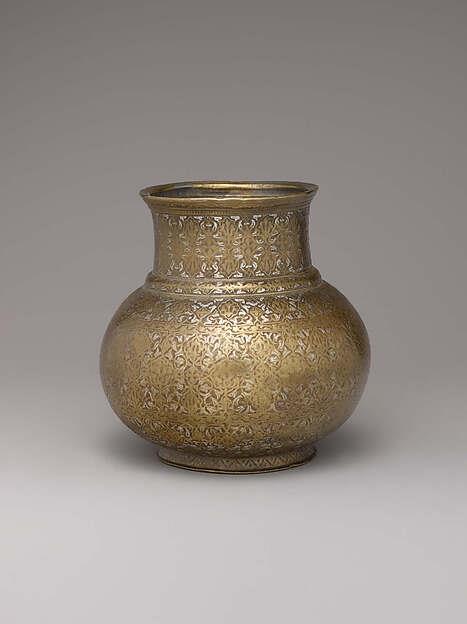 这种黄铜母羊的大腹便便的形状出现在中世纪晚期伊朗、中亚和中国的玉石、金属和陶瓷制品中。这只母羊是在帖木儿王朝统治下生产的,在镶嵌银和黑色化合物之前经过铸造和车削,其中大部分已经丢失。花卉交织和藤蔓卷轴的出现,以及背景中的交叉阴影,是15世纪初以后帖木儿金属制品的典型特征。