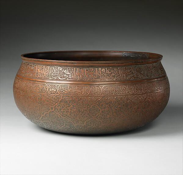 这个碗的定义元素——云卷轴、漩涡装饰、交错的圆形和"Y"图案——指向萨法维大不里士是最有可能的生产地点。紧挨着边缘的是什叶派的纳斯赫文字祈祷文。漩涡装饰中附有唤起丰富和幸福的诗句。所有者卡西姆·伊本·侯赛因·卡纳迪(Qasim ibn Husain Qannadi)的名字、艺术家的签名和制造日期出现在四叶形的更下方。碗也可以与十五世纪后期的土库曼金属制品学校联系起来,该学校与奥斯曼帝国和马穆鲁克帝国的艺术有着密切的风格联系。
