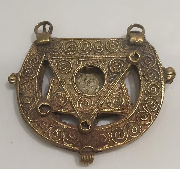 这些耳环(95.16.2和.3)是在伊拉克的al-Hillah发现的,是11至13世纪生产的已知类型。中心的卦可能暗示了所罗门的无比喻印章,这是一个在这个时期和地方的其他物体上发现的主题。根据传说,所罗门王直接从上帝那里获得了印戒形式的封印,这赋予了他指挥动物和超自然生物(精灵)的权力。所罗门之印成为整个伊斯兰世界流行的护身符主题,可以在许多物品的表面找到。