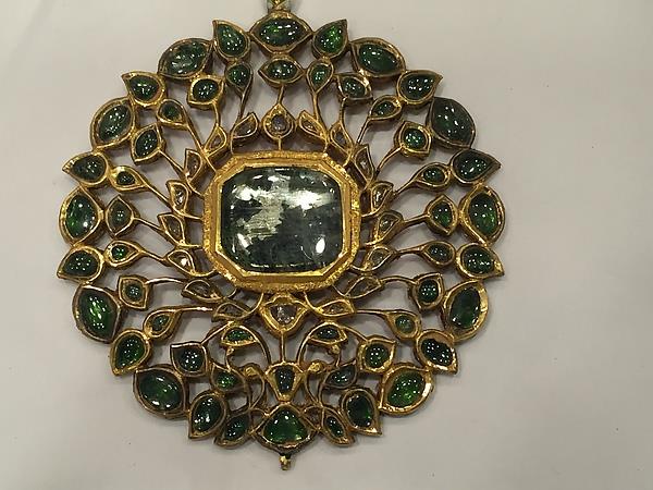 这种大的装饰品最初可能是用来装饰头部的,作为项链或手饰的一部分(hathphul)。中心宝石是一种浅绿色的绿柱石,最初镶嵌在背面,以创造出充满活力的深绿色。箔片已经变质,在中心石上留下了不均匀的外观。背面的红色、绿色和白色珐琅(meenakari)增强了这款饰品的花朵形状。