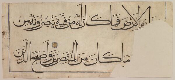 这一页的碎片来自有史以来最大的《古兰经》副本之一。每一行都是用穆哈卡风格写的,超过三英尺长,每一页最初都超过七英尺高。这一页可能来自书法家"乌玛尔·阿克塔"为统治者帖木儿写的一本巨大的《古兰经》(塔梅尔兰,公元1405年)。显然,帖木儿对"乌玛尔·阿克塔"写了一本小到可以放在图章戒指下的古兰经并不感冒,所以这位书法家又写了一本大到必须用手推车送到帖木儿那里的古兰经。
