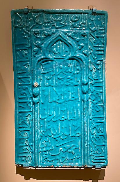 Evoking an architectural mihrab niche, the design of this tile includes columns topped by a multilobed arch. The vigorous calligraphic inscriptions that surround and fill the interior of the "niche" comprise an evocation to the Chahar‑dah Ma'sum (Fourteen Infallibles)—naming the twelve Shi'i Imams and the family of the Prophet Muhammad. The date of this tile places it within the reign of the Ilkhanid ruler Sultan Uljaitu, who was known to have embraced Shi'i Islam.