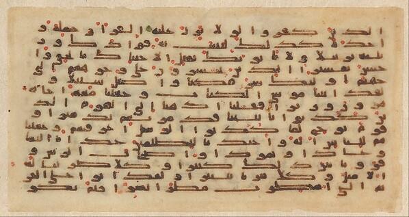 This small-scale Qur'an was used as an intimate personal object, probably worn or carried as an amulet during travel. Despite its diminutive size, it shares many features with other early Qur'ans, which were often much larger and used as memory guides for public recitations. Here, densely packed writing in kufic script is lengthened horizontally, and red dots mark short vowels.