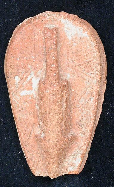 Flat objects such as this one, molded on one side, were used in the public bath (hammam). The opposite side, which is coarse due to the siliceous fragments in the clay, would be used to rub the skin. The number of bath scrapers which have survived display a wide variety of decorative motifs.