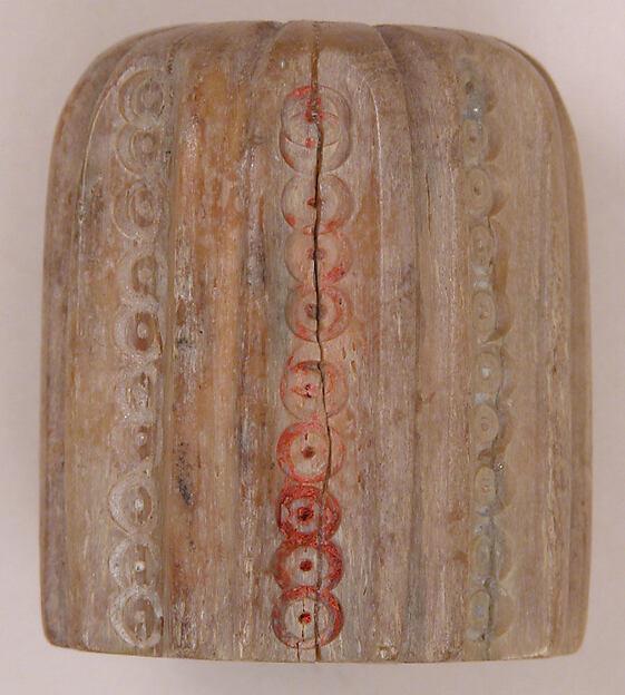 The dot-in-circle motif recalls designs presumed to be of magical significance, most likely an abstract eye to ward off the evil-eye, which serve an apotropaic function. Easily reproduced with a tool and visible in many cultures and times, this symbol may have lost its meaning, and become simply a decorative pattern, or may have one that we have not yet discovered