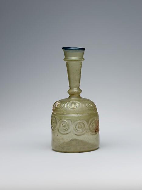This bottle was created with a number of complex glass-working techniques. The piece was made in two parts that were joined at the horizontal seam. Decoration was impressed with tongs before the pieces were joined. The blue glass thread around the rim gives a spark of color to this otherwise transparent piece. The bottle’s decoration consists of repeating bulls-eyes, a pattern that was especially popular in decorating the surfaces of small bronze vessels.