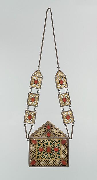 这些大胆的银饰来自中亚土库曼部落的世界。一些形式,如菱形护身符持有者或古兰经盒子,与宫廷和城市中心的珠宝艺术风格有关。但这些巨大而充满活力的装饰物大多是土库曼人独特情感的最终表达,因为他们的游牧生活让位于现代。