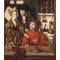 这幅画是北方文艺复兴时期艺术的著名杰作,由扬·凡·艾克去世后布鲁日(佛兰德斯)的主要画家彼得鲁斯·克里斯图斯于 1449 年签名并注明日期。该小组证明了荷兰艺术家对图像幻觉主义的浓厚兴趣和对细节的一丝不苟的关注,特别是在发光的珠宝、玻璃和金属制品、世俗和教会贸易商品方面,这些都是金匠精湛技艺的典范。这幅神秘画作中的主要人物长期以来一直被认为是圣埃利吉乌斯(金匠的守护神),因为存在光环,该光环被认为是后来添加的,随后被删除。这幅画很可能是一幅职业画,描绘了金匠的职业,也许是一个特定的金匠。技术分析显示,金匠脸部的底图需要非常仔细地建模 - 比这对夫妇的脸更仔细 - 表明肖像的可能性。有人认为他是威廉·范·弗勒滕(Willem van Vleuten),布鲁日金匠,曾为勃艮第公爵菲利普一世工作。1449年,这幅画的日期,公爵委托范弗吕滕在她与苏格兰国王詹姆斯二世结婚之际送给古尔德斯的玛丽的礼物。这幅画中很可能描绘了这对夫妇,描绘了购买一枚在秤上称重的结婚戒指。从商店的壁架延伸到观众空间的腰带是对婚姻的进一步暗示。凸面镜将图像空间与外面的街道连接起来,反射出两个带着猎鹰(骄傲和贪婪的象征)的年轻人,并在观众的不完美世界与这里描绘的美德和平衡世界之间建立了道德比较。