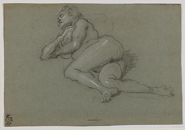 Domenico was the son and pupil of the renowned Venetian master, Jacopo Tintoretto. While the influence of Jacopo’s rhythmical line is evident in the drawings of his son, Domenico developed an individual style of draftsmanship characterized by softer and more naturalistic modeling, as illustrated in this study of a female nude, one in a series depicting heavily foreshortened figures in various reclining poses, including several others in the Lehman Collection. These studies may have served as reference points for the voluptuous, recumbent figures of Venus and Danae that abound in paintings by the Tintoretto workshop Domenico’s series of female nudes epitomize the primacy of drawing after live models in the Tintoretto workshop.