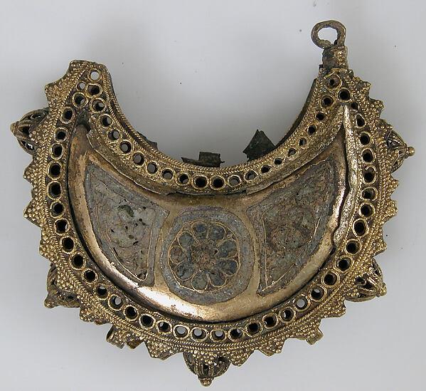 These earrings combine diverse artistic features-Byzantine (cloisonné enamel decoration), Kyivan Rus' (enameling in segments), and Islamic (boxlike construction)-suggesting that the artist had knowledge of several traditions. The earrings have lost their suspension loops.