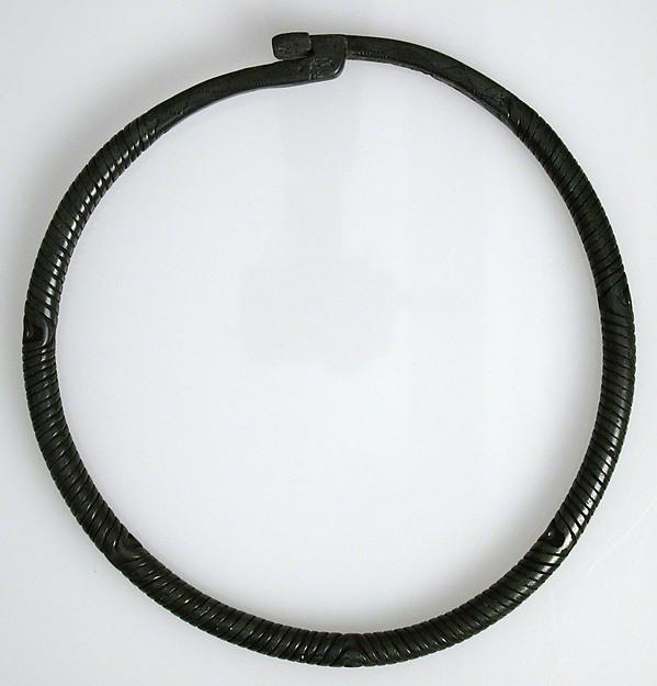 The design of this torque is deceptive. It appears to be wrapped with a wide, flat wire that changes direction six times. In fact, the complex pattern has been cut into the metal. Although it is not known where this object was found, torques such as this have been discovered in peat bogs where it is thought that they were cast as offerings to a god or goddess or as symbols of thanksgiving.