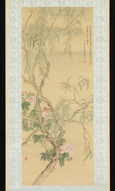 Chinzan was raised in Edo in a samurai family. He trained under the Nanga painters Tani Bunchō (1763–1840) and Watanabe Kazan (1793–1841) and favored Chinese literati artists of the Ming dynasty (1368–1644). Specializing in paintings of birds and flowers, he was an avid participant in sencha tea ceremonies, during which he would enjoy viewings of Chinese paintings and antiquities owned by his associates. He enhanced this painting with a poem that alludes to a passage from the "Song of Everlasting Sorrow" by the Tang dynasty (618–906) poet Bai Juyi (772–846). In it, Chinzan imagines the moon shining on the face of Lake Taiye and wonders if someone, a person he does not directly identify, still dances in the heavens in the deep of night. As the crisp autumn air of the west wind awakens him from his musings, he finds he can still smell her fragrance on the dew. In the original poem, the emperor discovers that, after the tragic death of his beautiful love, Yang Guifei, the hibiscus by Lake Taiye reminds him of her face, while the willows at Weiyang Palace recall her eyebrows. In this way, the contemporary poem and painting are brought together by the ancient text.