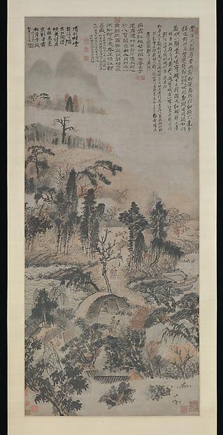 Exploring the theme of intoxication, Shitao makes us reel with the unsteadiness of his figures and landscape. He probably created this picture to commemorate an autumn outing in the hills with friends. The three inscriptions testify to the pleasure and pride that Shitao took in his achievement; they make it clear that the exhilaration experienced by the friends was inspired by nature, poetry, conviviality,
