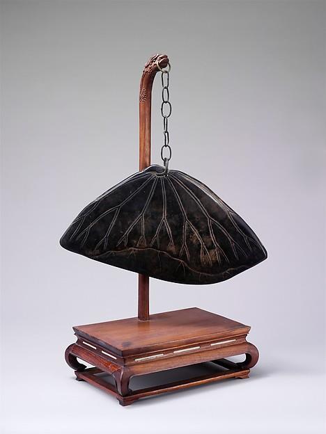 Carefully incised veins suggest a downwardly curving lotus leaf of dark nephrite jade. The goqing once sounded to announce the arrival and rank of a guest or to denote the length of a pause following the completion of a musical piece. The great importance of sonorous substances, such as wood and stones, among the percussion instruments of the Far East stems from the religious belief that nature itself speaks to the human ear through this vibrating matter.