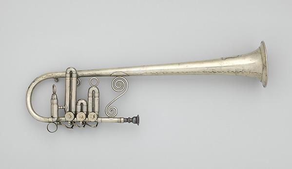 这是一款典型的带串动旋转阀的肩上喇叭。这些乐器被用于军乐队,军乐队被安置在行进中的士兵面前。钟声指向后方,这样跟随在乐队后面的士兵就能听到。这些乐器在南北战争期间很常见,直到19世纪80年代才被乐器制造商宣传。