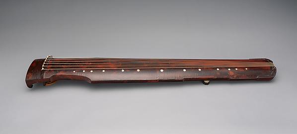 Endowed with cosmological and metaphysical significance and empowered to communicate the deepest feelings, this zither, beloved of sages and of Confucius, is the most prestigious instrument in China. Han Dynasty (206 B.C.-220 A.D.) writers state that the qin helped to cultivate character, understand morality, supplicate gods and demons, enhance life, and enrich learning. Ming Dynasty (1368-1644) literati who claimed the right to play the qin suggested that it be played outdoors in a mountain setting, a garden or a small pavilion or near an old pine tree (symbol of longevity) while burning incense perfumed the air. A serene moonlit night was considered an appropriate time for performance. Each part of the instrument is identified by an anthropomorphic or zoomorphic name and cosmology is ever present: for example, the upper board of wutong wood symbolizes heaven, the bottom board of zi wood symbolizes earth. Qins over a hundred years old are considered best, the age determined by the pattern of cracks (duanwen) in the lacquer. The 13 studs (hui) indicate finger positions. Strings of varying thicknesses are traditionally made of twisted silk.