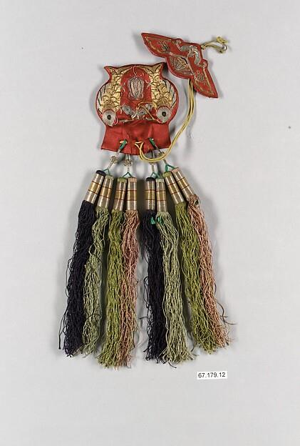 The paired fish embroidered on this small purse are said to symbolize harmony, and the purse’s cover is in the shape of a stone chime—a rebus for “celebration.”