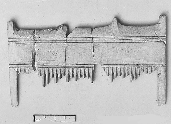 This comb and two others (16.1.428–.429) were found in the remains of an anthropoid (human-shaped) coffin that was excavated by the Museum's Egyptian Expedition in 1916. Although the dimensions vary slightly, all three have shape that is typical of the late-Seventeenth and early-Eighteenth Dynasties. For a similar comb from the same time-period, but made of wood, see 26.7.1448.