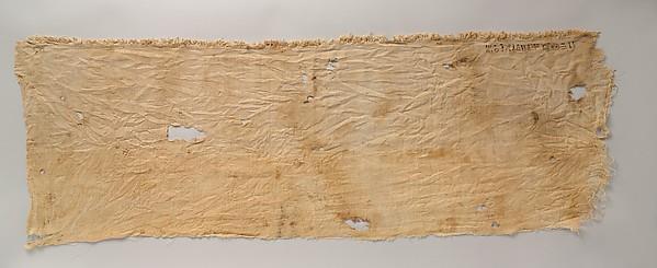 This piece of linen cloth is inscribed in two places. In the upper right corner, the inscription reads: The Good God, Lord of the Two Lands, Nebkheperure, Beloved of Min, linen of year 6. The second inscription, at the center bottom of the sheet, is two lines of hieratic (a cursive form of Egyptian writing) and has, thus far, proven illegible. |